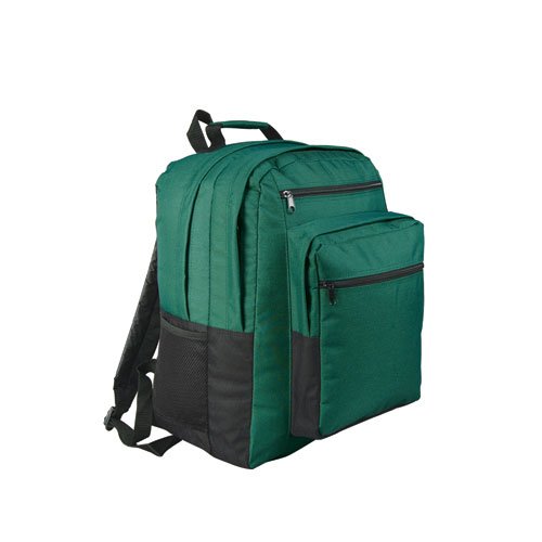 MATERIAL: 600D Polyester SIZE: 12-1/2" X 16-1/2" X 8-1/2" IMPRINT AREA: 7-1/2" X 6-1/2" FEATURE: Two double zippered main compartments, front zippered pocket and two mesh side pockets. COLORS: Black, Navy, Dark Green PACKED: 12 PCS./ CTN.